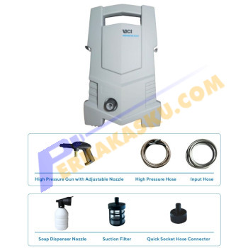| Kelengkapan | High Pressure Hose. High Pressure Gun with Adjustable Nozzle. Soap Dispenser Nozzle. Input Hose. Quick Socket Hose Connector. Suction Filter. |