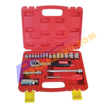 | Kelengkapan | 7 pcs 3/8" DR. Hand Socket : 10, 11, 12, 13, 14, 17, 19 mm, 1 pcs 3/8" DR. Spark Plug Socket 21 mm, 2 pcs 3/8" DR. Extension Bar 3" & 6", 1 pcs 3/8" DR. Ratchet Handle 8" Rubber Handle 72 Teeth, 7 pcs 1/4" DR. Hand Socket : 4, 4.5, 5, 6, 7, 8, 9 mm, 1 pcs Spanner Handle 1/4", 1 pcs Adaptor : 3/8" F x 1/4" M |