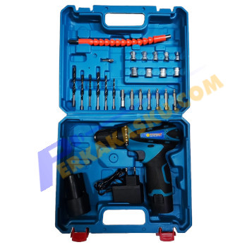| Kelengkapan | 2x Baterai, 1x Charger Baterai, 1x Plastik Case, 3 pcs Twist Drill Bit ( 4mm , 5mm , 6mm ), 3 pcs 3 Point Wood Drill Bit ( 4mm , 5mm , 6mm ), 1 pcs Flexible Shaft H1/4" x 250 mm, 2 pcs Screw Drive Bits Slot (-), 2 pcs Screw Drive Bits Philip (+), 2 pcs Screw Drive Bit ( Bintang ), 1 pcs Driver Bit Holder 1/4", 9 pcs Mata Socket ( 5, 6, 7, 8, 9, 10, 11, 12, 13 mm) |